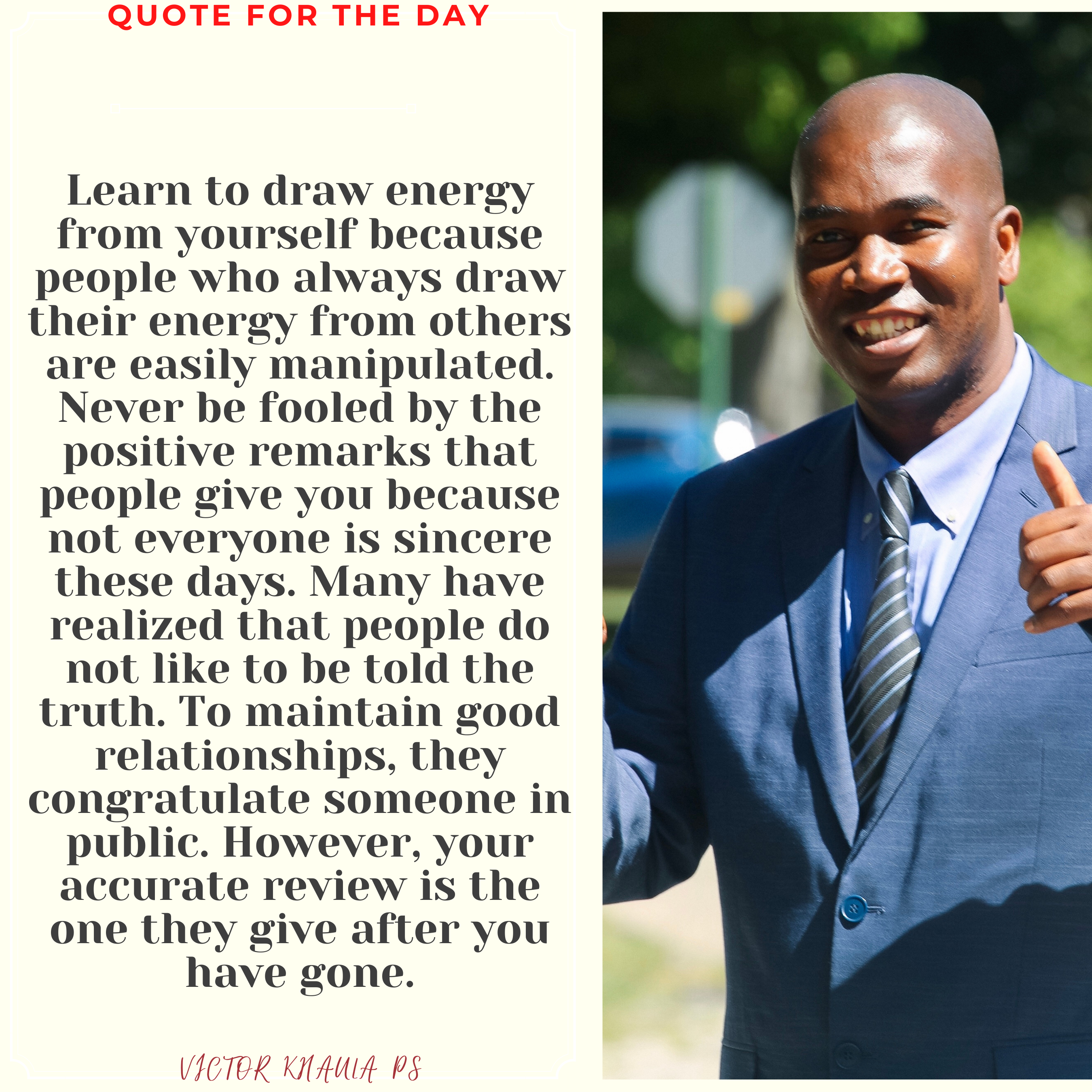 Today’s quote reminds us to draw our energy from ourselves because it will help us avoid being fooled by praises that fake people make.