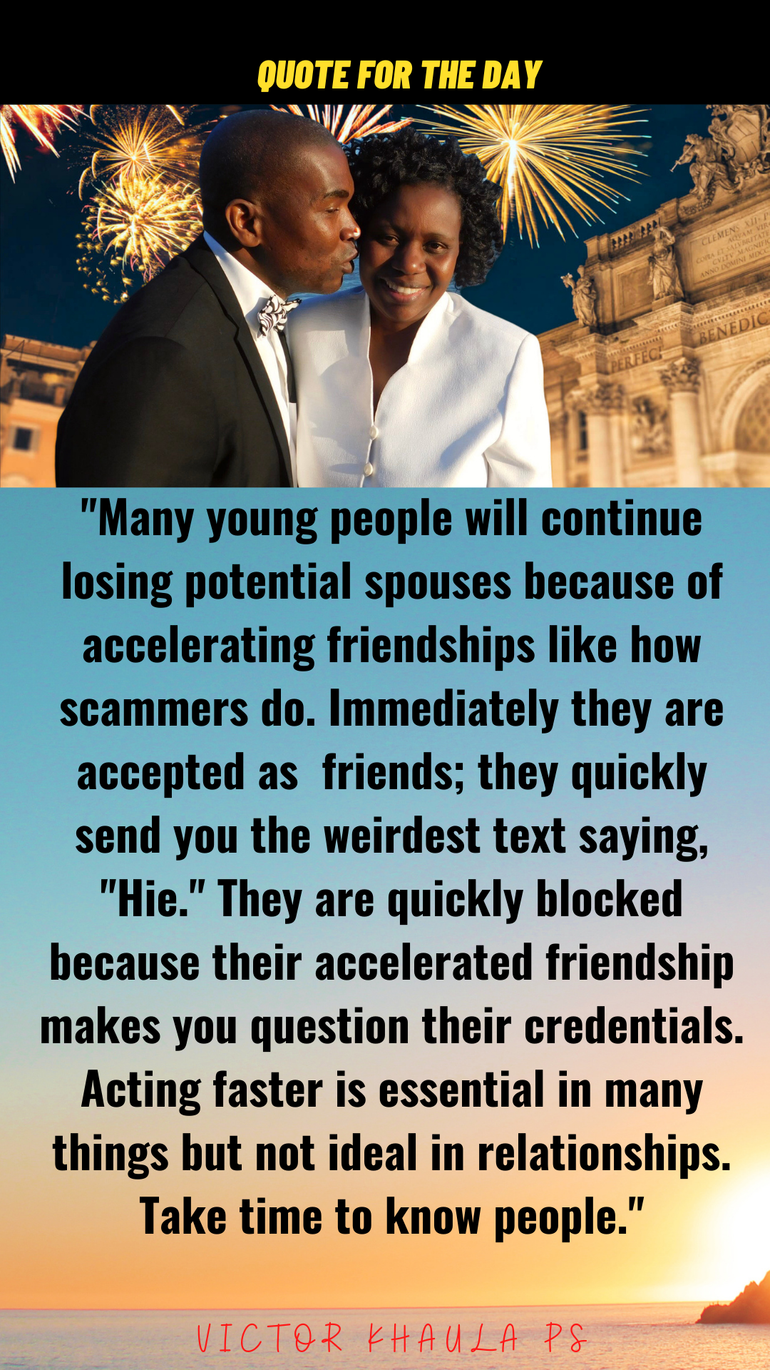 Today’s quote reminds youths looking for potential partners to stop acting like scammers who hasten their new relationships.