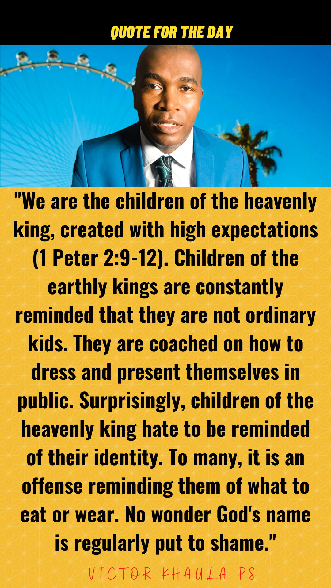 Today’s quote reminds us of our identity as God’s children that are expected to live according to the heavenly standards.