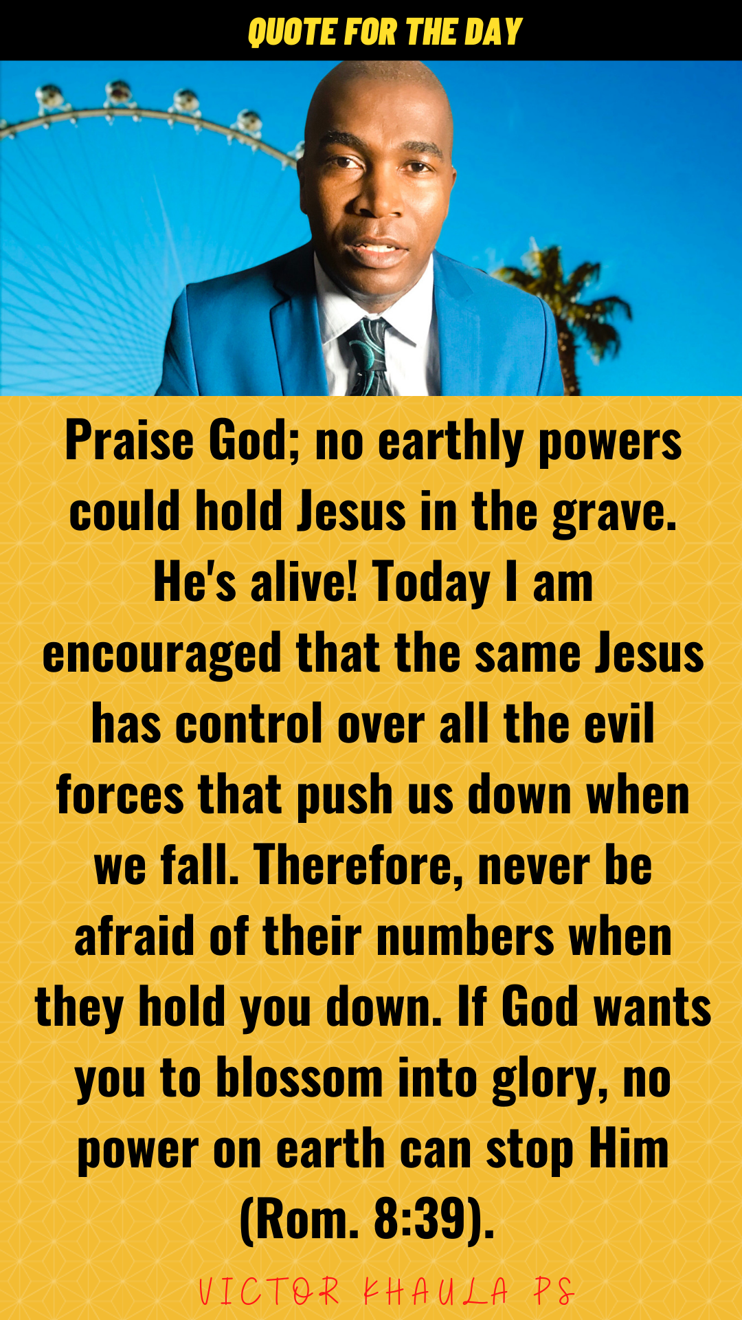 Praise God; no earthly powers could hold Jesus in the grave. He’s alive! Today I am encouraged that the same Jesus has control over all the evil forces that push us down when we fall. Therefore, never be afraid of their numbers when they hold you down. If God wants you to blossom into glory, no power on earth can stop Him (Rom. 8:39).