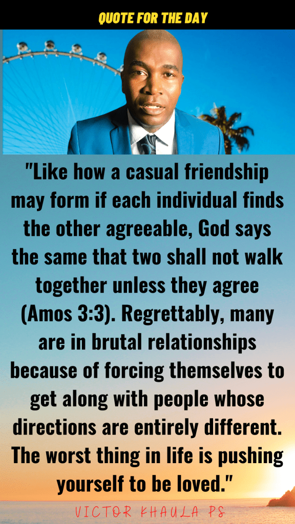 Like how a casual friendship may form if each individual finds the other agreeable, God says the same that two shall not walk together unless they agree (Amos 3:3). Regrettably, many are in brutal relationships because of forcing themselves to get along with people whose directions are entirely different. The worst thing in life is pushing yourself to be loved.