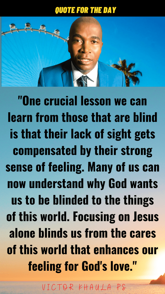 One crucial lesson we can learn from those that are blind is that their lack of sight gets compensated by their strong sense of feeling. Many of us can now understand why God wants us to be blinded to the things of this world. Focusing on Jesus alone blinds us from the cares of this world that enhances our feeling for God’s love.