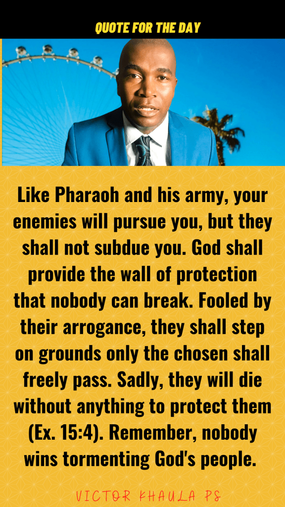 Like Pharaoh and his army, your enemies will pursue you, but they shall not subdue you. God shall provide the wall of protection that nobody can break. Fooled by their arrogance, they shall step on grounds only the chosen shall freely pass. Sadly, they will die without anything to protect them (Ex. 15:4). Remember, nobody wins tormenting God’s people.