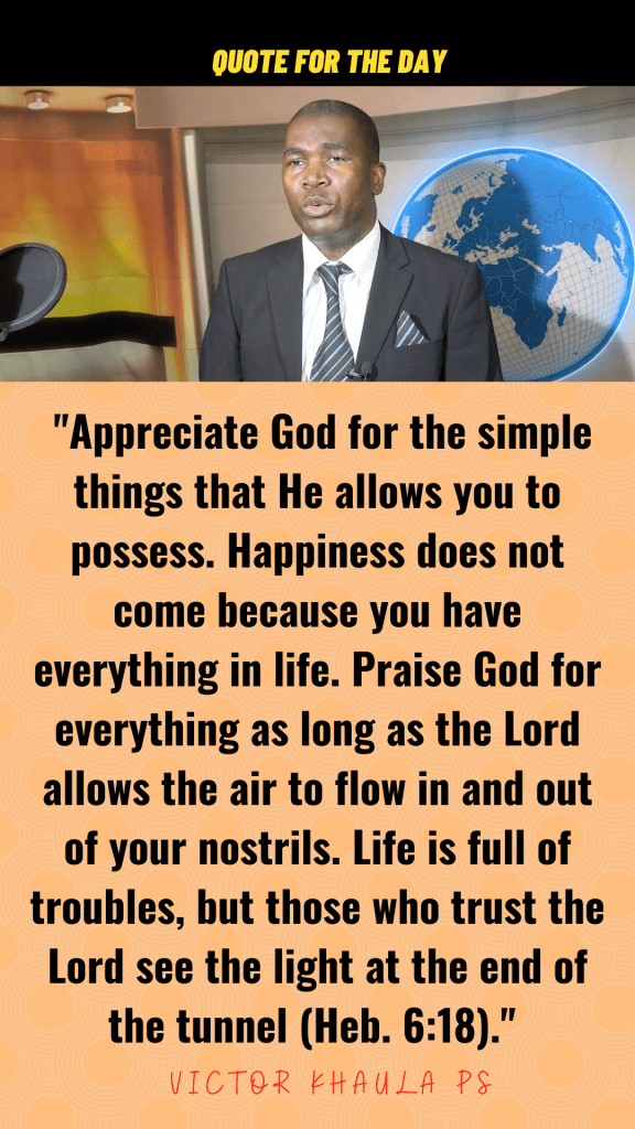 Appreciate God for the simple things that He allows you to possess. Happiness does not come because you have everything in life. Praise God for everything as long as the Lord allows the air to flow in and out of your nostrils. Life is full of troubles, but those who trust the Lord see the light at the end of the tunnel (Heb. 6:18).