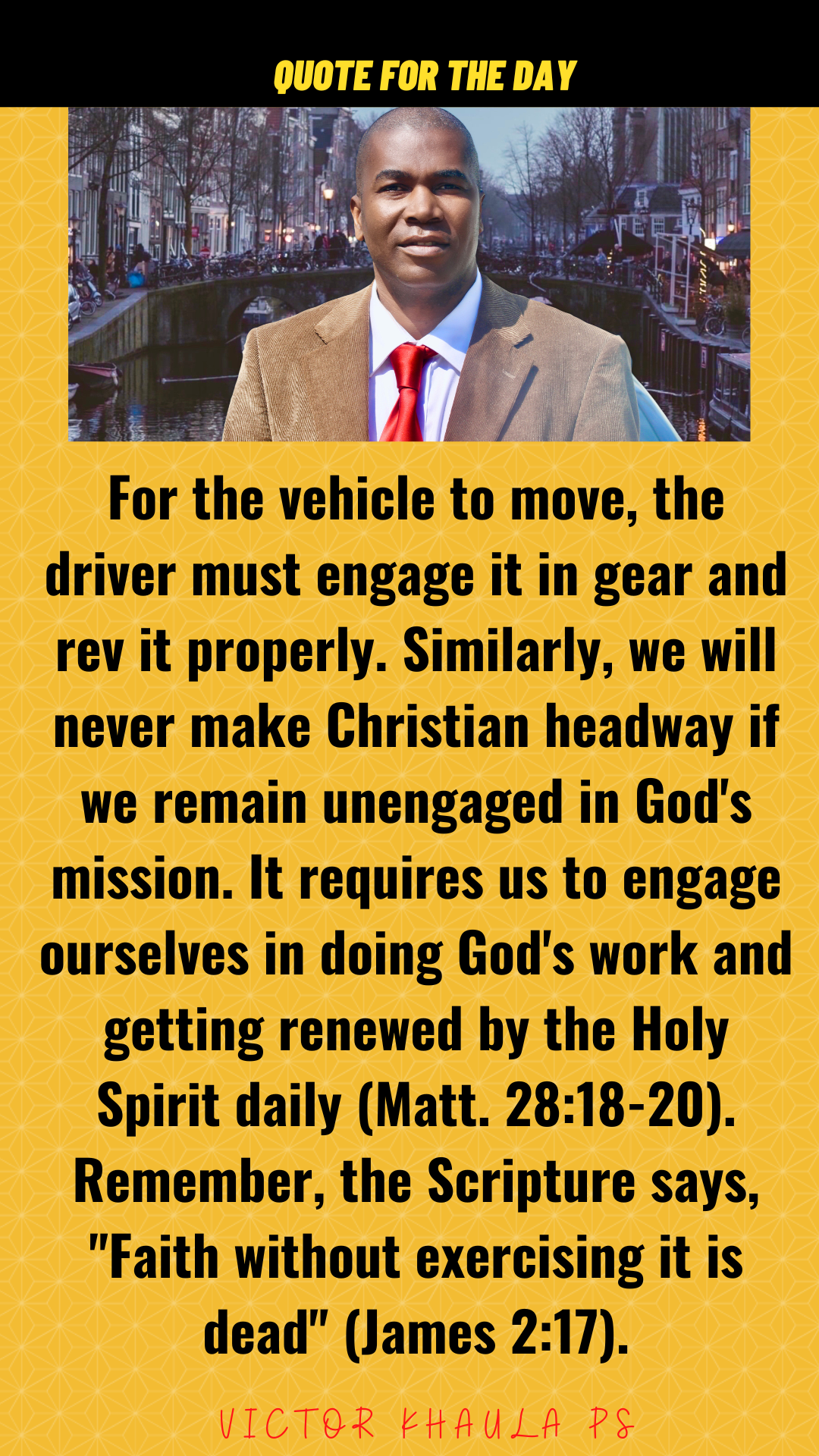 For the car to move, the driver must engage it in gear and rev it properly. Similarly, we will never make Christian headway if we remain unengaged in God’s mission. It requires us to engage ourselves in doing God’s work and getting renewed by the Holy Spirit daily (Matt. 28:18-20). Remember, the Scripture says, “Faith without exercising it is dead”(James 2:17).