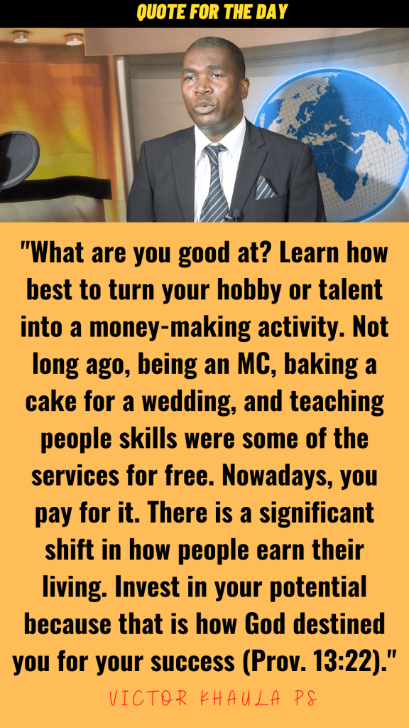 “What are you good at? Learn how best to turn your hobby or talent into a money-making activity. Not long ago, being an MC, baking a cake for a wedding, and teaching people skills were some of the services for free. Nowadays, you pay for it. There is a significant shift in how people earn their living. Invest in your potential because that is how God destined you for your success (Prov. 13:22).”