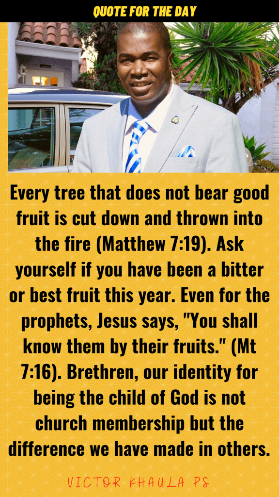 Every tree that does not bear good fruit is cut down and thrown into the fire (Matthew 7:19). Ask yourself if you have been a bitter or best fruit this year. Even for the prophets, Jesus says, “You shall know them by their fruits.” (Mt 7:16). Brethren, our identity for being the child of God is not church membership but the difference we have made in others.