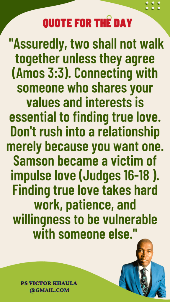 “Assuredly, two shall not walk together unless they agree (Amos 3:3). Connecting with someone who shares your values and interests is essential to finding true love. Don’t rush into a relationship merely because you want one. Samson became a victim of impulse love (Judges 16-18 ). Finding true love takes hard work, patience, and willingness to be vulnerable with someone else.”