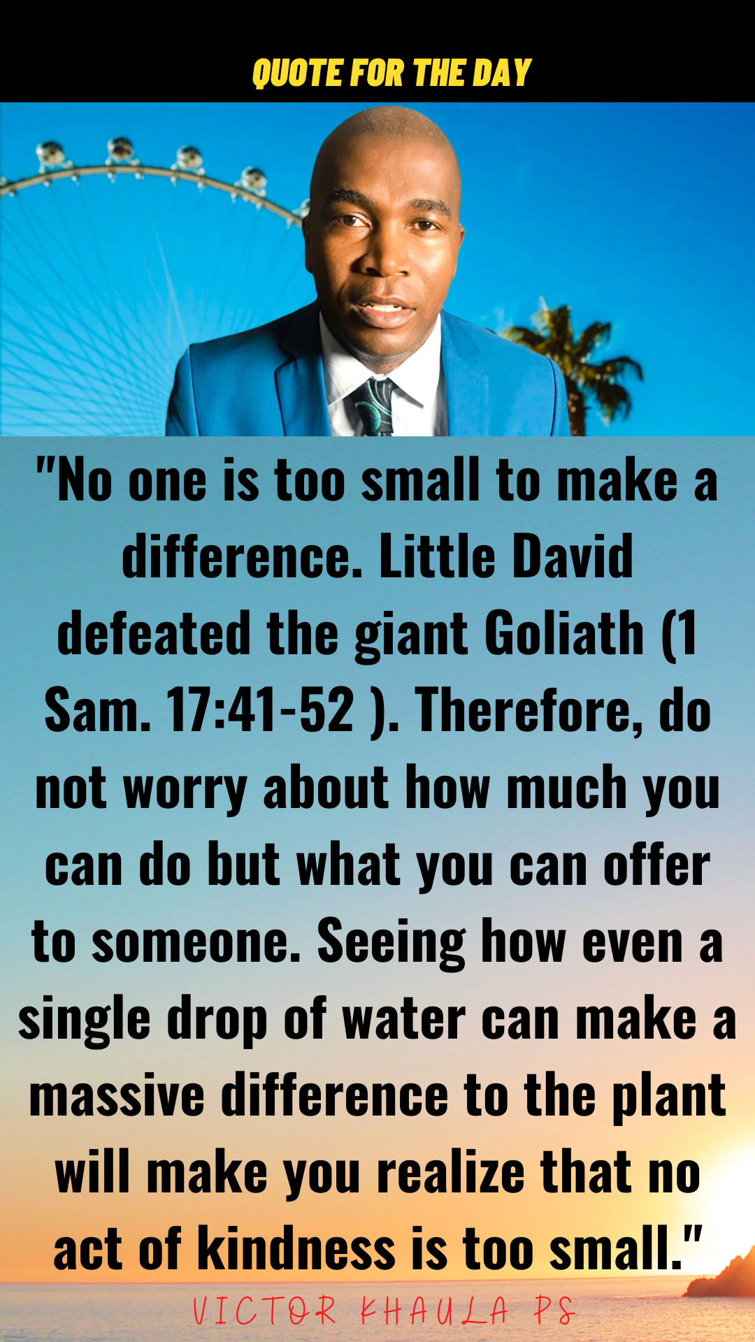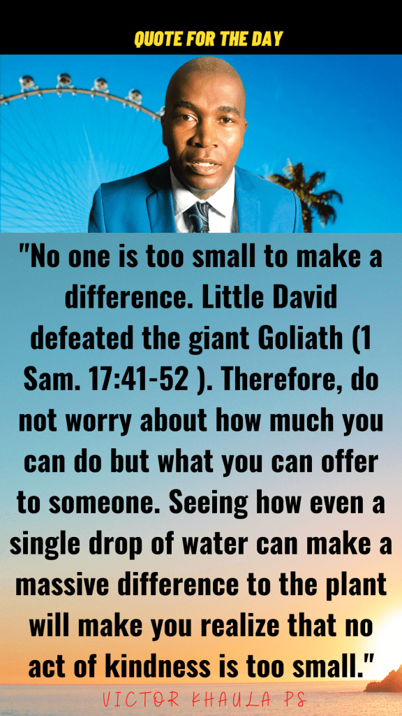 “No one is too small to make a difference. Little David defeated the giant Goliath (1 Sam. 17:41-52 ). Therefore, do not worry about how much you can do but what you can offer to someone. Seeing how even a single drop of water can make a massive difference to the plant will make you realize that no act of kindness is too small.”