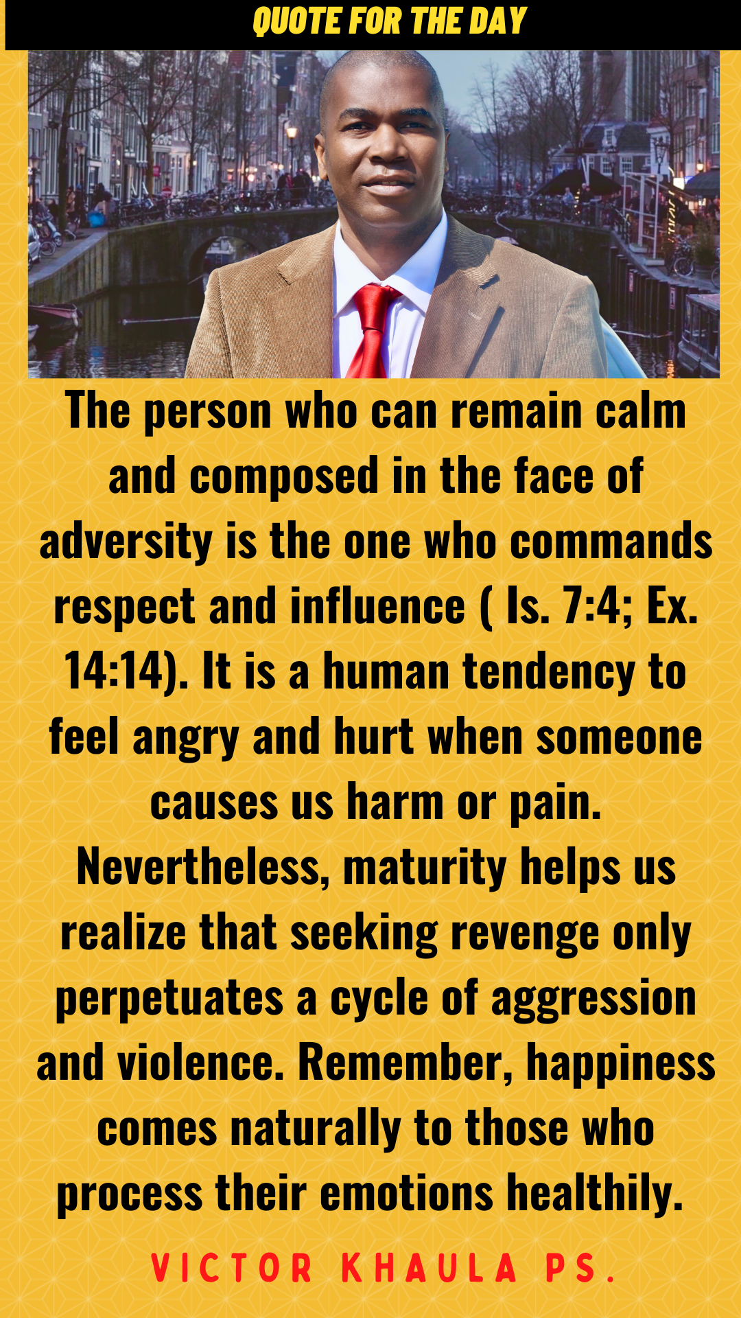 “The person who can remain calm and composed in the face of adversity is the one who commands respect and influence ( Is. 7:4; Ex. 14:14). It is a human tendency to feel angry and hurt when someone causes us harm or pain. Nevertheless, maturity helps us realize that seeking revenge only perpetuates a cycle of aggression and violence. Remember, happiness comes naturally to those who process their emotions healthily.”