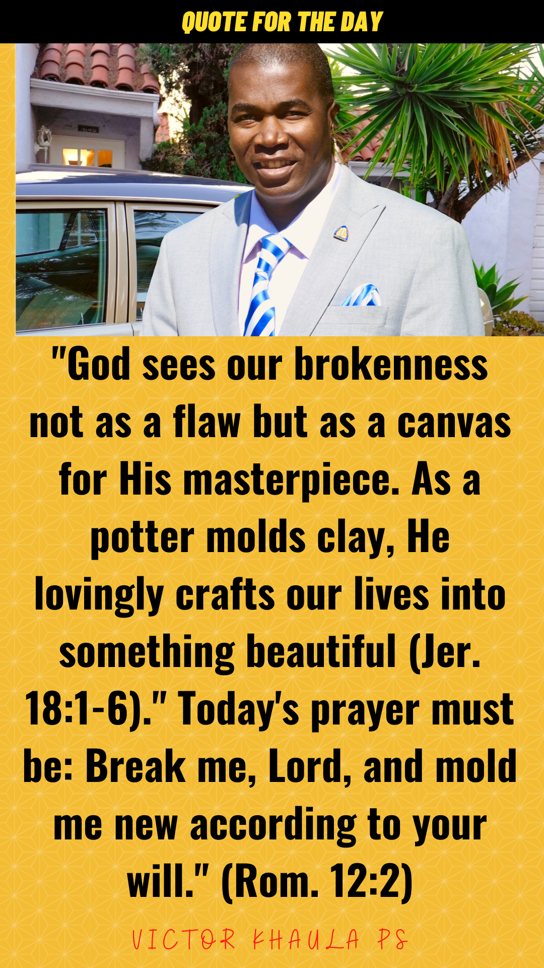 “God sees our brokenness not as a flaw but as a canvas for His masterpiece. As a potter molds clay, He lovingly crafts our lives into something beautiful (Jer. 18:1-6).” Today’s prayer must be: Break me, Lord, and mold me new according to your will.” (Rom. 12:2)