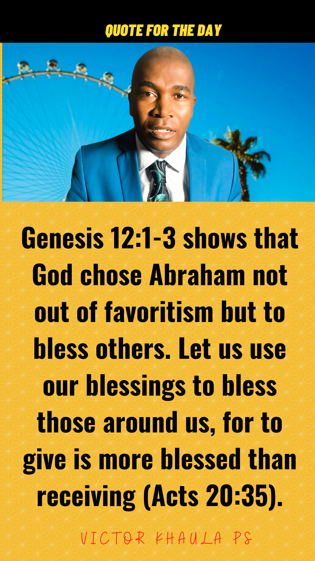 “Genesis 12:1-3 shows that God chose Abraham not out of favoritism but to bless others. Let us use our blessings to bless those around us, for to give is more blessed than receiving (Acts 20:35)”.