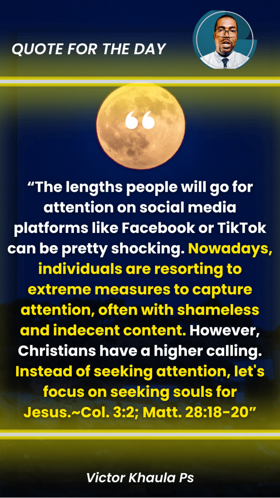 “The lengths people will go for attention on social media platforms like Facebook or TikTok can be pretty shocking. Nowadays, individuals are resorting to extreme measures to capture attention, often with shameless and indecent content. However, Christians have a higher calling. Instead of seeking attention, let’s focus on seeking souls for Jesus.~Col. 3:2; Matt. 28:18-20”